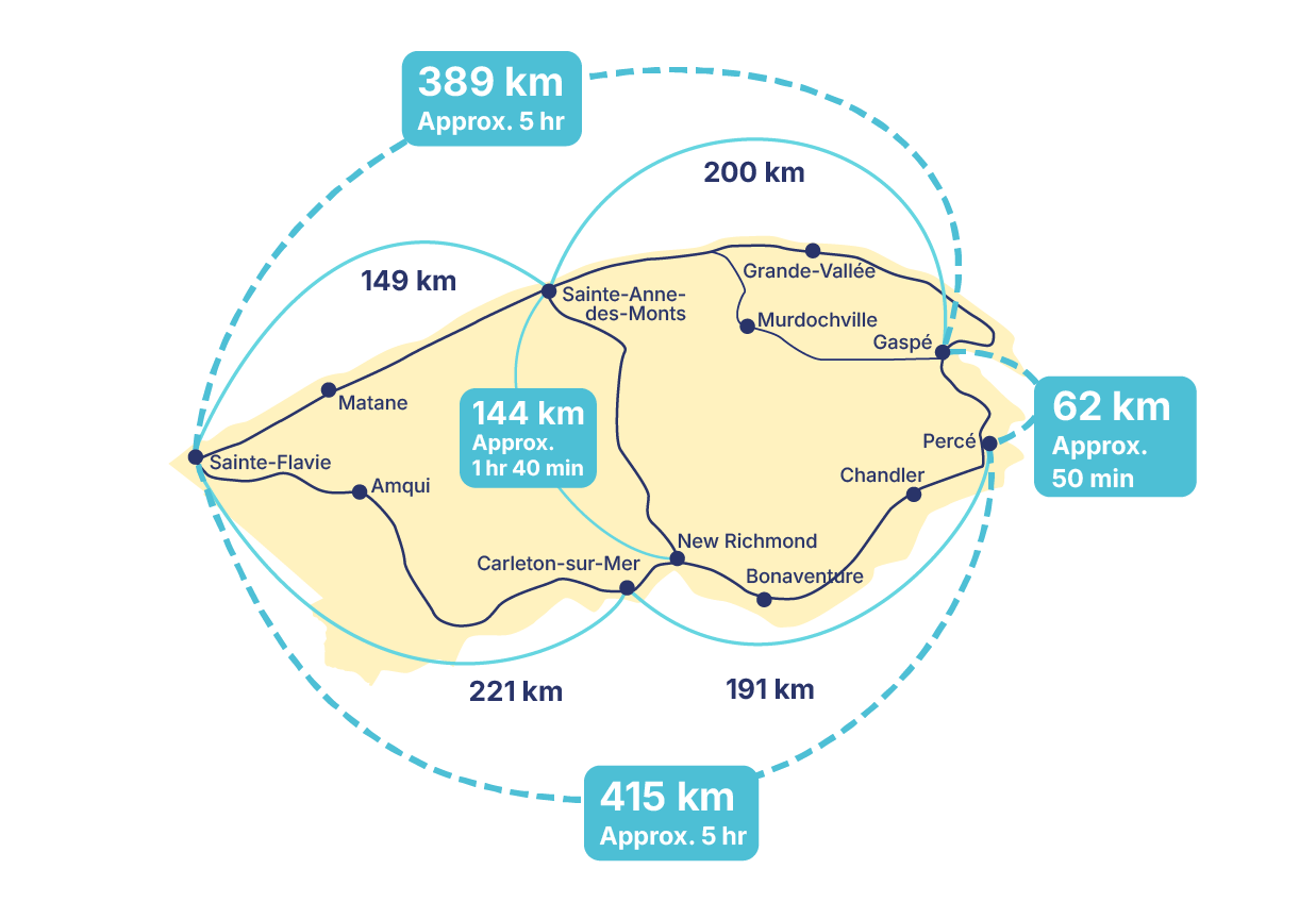 Distances and travel time in Gaspésie