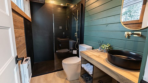 All three chalets are equipped with a full kitchen, high-quality bedding, an electric fireplace and radiant heating, air conditioning, a private hot tub on the deck, a Big Green Egg charcoal barbecue, a private outdoor fireplace, a diffuser, PURE skincare products, bathrobes and more.