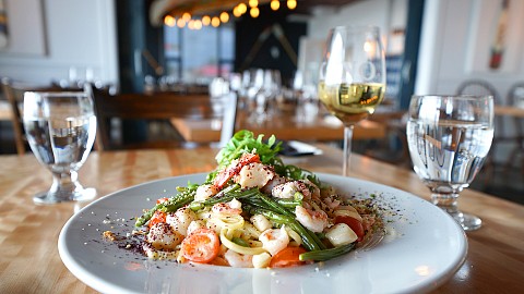 Cuisine locale gourmande inspirée de la terre et de la mer, plats végétariens, sans gluten et pour enfants, avec une superbe vue sur la Baie des Chaleurs!
